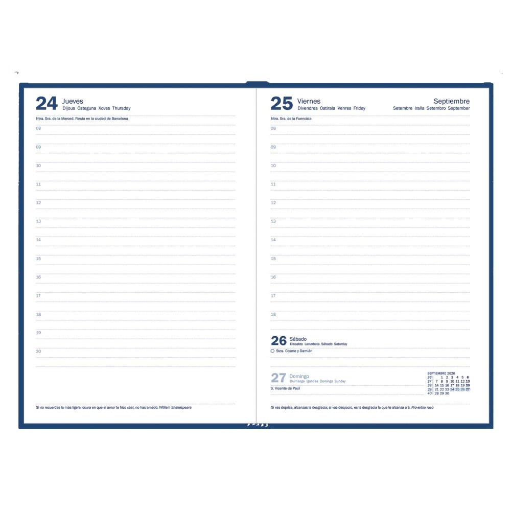 Tamaño 14,5 x 21 cm. Tapa dura encuadernada en balacrón. Viernes y fin de semana en la misma página. 288 páginas. Papel 80 g/m1 FSC. Listín unido con teléfonos 1 notas. anta de registro. Meses y días de la semana en: castellano, catalán, euskera y gallego. Planning mensual, santoral y frases y dtas en cada página del dietario.