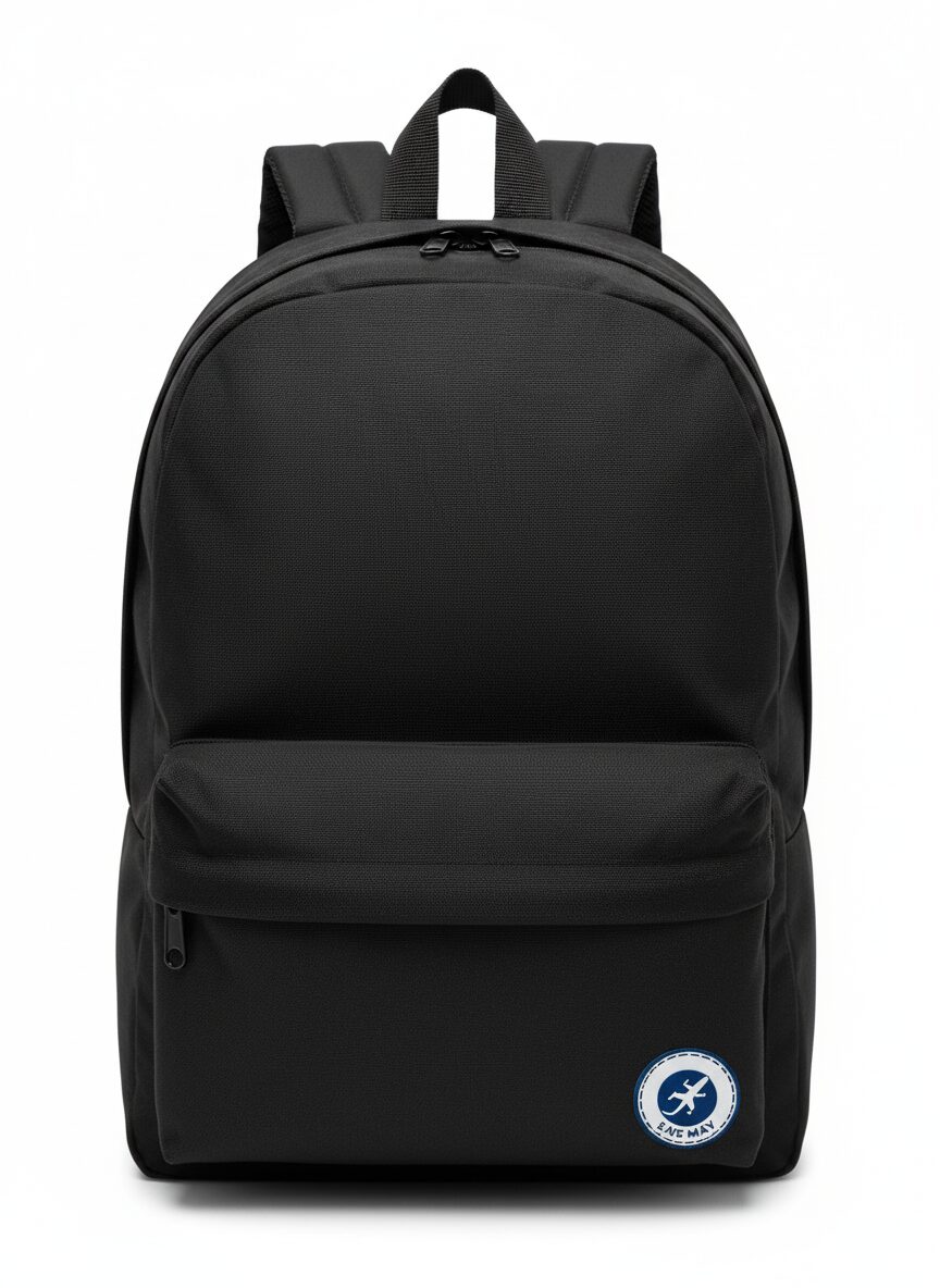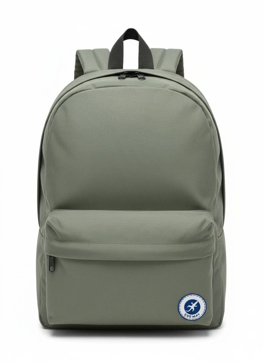 Mochila con bolsillo frontal, asas acolchadas y cierres de cremallera. Colores básicos: gris y negro.
